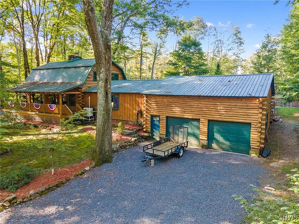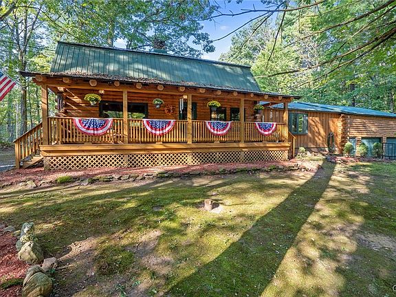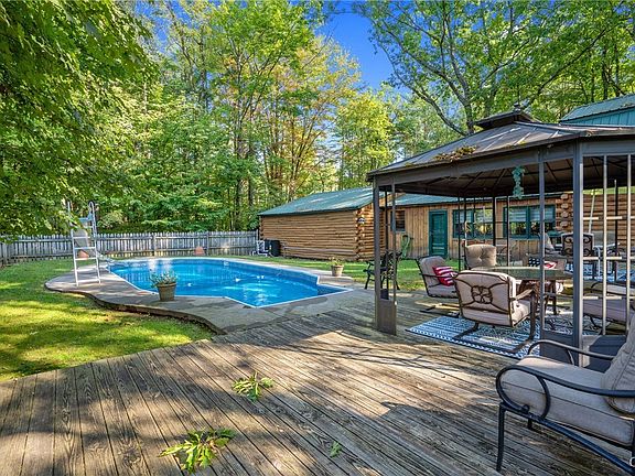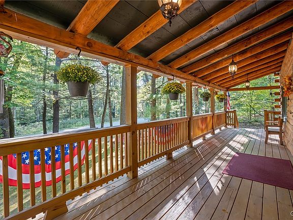 This incredible beautiful log home definitely gives you the Adirondack feel specially sitting on 42 acres of privacy. From the inviting 300 Sq ft front porch you enter into just spacious rooms, including and Eat-in kitchen,with newer appliances, a sunken living room with wood stove, and a spacious family room complete with gorgeous stone hearth. Upstairs is 4 bedrooms, half bath & plenty of closets & built-ins. There is an enclosed porch off of the living room, overlooking a fenced in area with heated 16 x32 inground, pool and patio. the 20 x 30 Pole Barn used to have stalls for horses - now can be used for whatever your heart desires! House is heated very well by the Electric Mini splits or the wood stove. Oversized 2 car garage completes this package!
