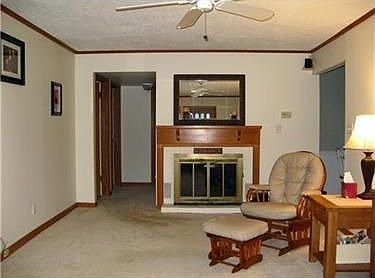 A private tree bordered setting of 3 lots nestles this easy care single level. Vinyl sided, tilt-in vinyl replacement windows. Roomy L-shaped living room w/cozy brick fire-place. Recent kitchen & bath updates. Freshly painted interior, newer carpet thru-out. 22x10 Encl breezeway. Appliances incl