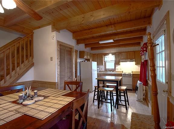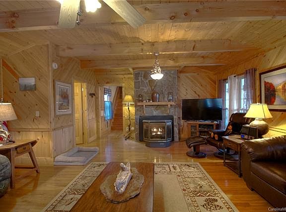 Tree-top Cabin hideaway offering solitude for those that seek it on 1.35 acres. Enjoy the long range view and the sound of the nearby creek from the swing on the wrap-around porch. Soak up Nature! Plenty of room for a fire pit in backyard. Home offers wood floors in Family Room, Bonus, dining. Tongue & Groove walls in Family room for that rustic mountain feel. Sleeping quarters upstairs-one bedroom/one bonus room both w/closets. Spacious living area is 20X16 with a cozy gas fireplace that nicely warms the area, functional kitchen and a nice size dining area. A rock faced wood burning fireplace is located in the dining/kitchen area taking candlelight dinner to a whole new level! Perfect for vacation rental market. Cozy enough for 2, spacious enough for 8. Close to the beginning of Cranberry Falls subdivision making it easier to access. Close to the National Park, Harrah's, BR Parkway, Maggie Valley and Waynesville. Some Furnishings are available for purchase.