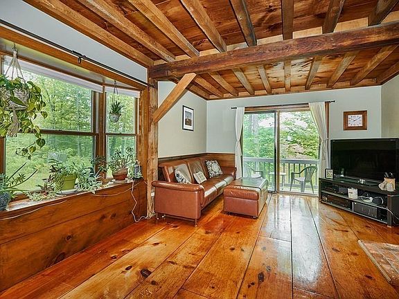 Sweet, Country GEM on 10+ acres! Lovingly maintained home w/freshly painted exterior, wide-pine floors has a tranquil yard, mixed woods & private hiking right outside your doorstep! This Charmer offers an updated kitchen w/tile backsplash & counters, maple cabinets, formal DR & large LR w/bay window, slider to exterior, fireplace & wood stove + magnificent sunset views. Upstairs are 3 bedrooms, 1 BTH + ample closet space & storage. Basement has finished laundry room, Buderus boiler 2018, 2 car garage + carport. As a bonus - there's an income producing side-by-side apartment! Lovely apt has a cheerfully updated kitchen w/dining area, a bank of large windows, and a back door to a private patio. Walk up to a combined living room/bedroom w/wood stove, large full bath w/stackable washer/dryer. See video & pix of apartment as it will only be viewed on 2nd showings. Approx 9 acres in Franklin Land Trust - Be serenaded by owls, catch glimpses of wildlife from your private refuge in the woods!