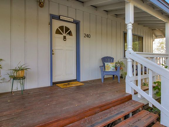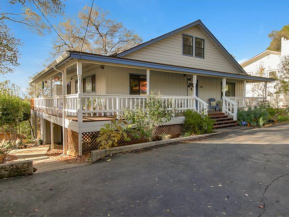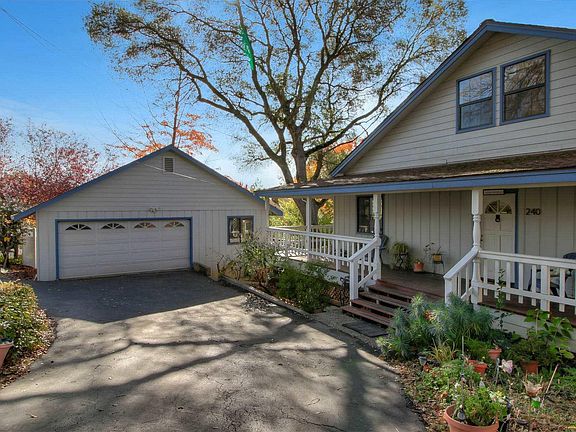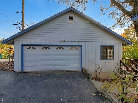 This home is a three-bedroom + multiple purpose rooms home with 3 full bath and a fourth ½ bath. It features a detached garage with an extra office/room and a loft with substantial storage space. The 1/3 acre yard has four mature oak trees + 20 fruit trees, an herb garden and terraced areas for recreation. The house itself features a great room with 12-foot high vaulted ceiling, a sunroom, a loft overlooking the main living area and the artisinal stained glass window. On main floor (street level, built 1987): * Covered, wrap-around Redwood deck with large storage cabinets, electric retractable awning, canyon view * 12-foot high vaulted ceiling in great room with artisanal triangular stained-glass window at the apex * Loft overlooking great room with two storage closets and attic access * Two skylights (one in a bathroom, other in an office/reading room) * Open kitchen plan with built-in oven, range, dishwasher, breakfast counter * Mud-room with utility counter and sink * Laundry center with washer and dryer * Bedroom #1 with walk-in closet and en-suite bathroom #1 * Bedroom #2 features display shelves on all four walls, access to bath#2 * Evaporative cooler, central heating, plus wood-burning stove * New paint in main living areas 2020 Downstairs (finished basement 1993): * Lockable access door (enables a separate residence) * Mini-kitchen and pantry with sink, cupboards, full-sized refrigerator/freezer * Office space with pass-through window to sink area * Terracotta tile flooring * Bathroom (1/2 bath)#3 with access to secret closet + extra storage space * Hidden electronic floor-safe * Large master-bedroom#3 with cloud-pattern painted walls and ceiling * Master en-suite bathroom#4 with double-sized tiled shower * Large walk-in closet with built-in cabinets and cedar paneling * New carpeting 2020 * Two large sliding glass doors with view of the garden * Separate central heating and central air * Wood-burning stove #2 * All windows and doors double-paned Detached garage and extra office/storage space: * 6x12' office or storage space with its own separate Redwood deck * Two-car garage space with electronic openers and window on ground floor * Large loft storage space with staircase Yard: * 1/3 acre lot with native and other plants including Rainbird drip irrigation system * Four mature healthy Oak trees, 20 fruit trees (apple, pear, cherry, peach, plum, pomegranate) * Asphalt paved circular driveway * Terraced recreation space with level picnic area Neighborhood: * Quiet cul-de-sac residential street in oak forested area less than one mile to Hwy 49 and downtown Sonora (Saratoga Acres subdivision) * Water: City of Sonora * Power: PG&E * Gas: JS West Propane * Internet: Comcast Ultra-high-speed cable