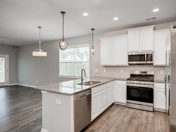 Welcome to this beautifully maintained 4BR/3BA home that combines comfort and style in every detail. The Hazelwood floorplan features a spacious master suite and an additional bedroom, perfect for guests or an office on the main floor. Upstairs, you'll find two more cozy bedrooms. The kitchen is a chef's dream, boasting granite countertops, ample cabinetry, a gas stove, tile backsplash, pendant lighting, and a top-of-the-line appliance package. Enjoy the elegance of engineered luxury plank flooring downstairs, while the upstairs bedrooms are carpeted for added comfort. The home is accented by wood stairs with iron spindles and two-inch wood blinds throughout.