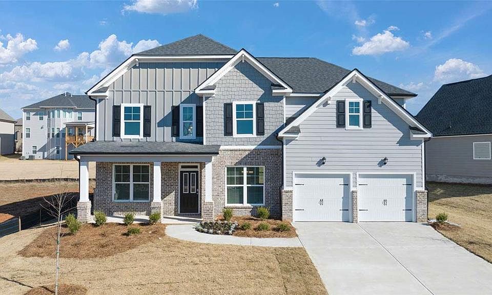 Introducing the Savannah floor plan where elegant design meets everyday functionality. Zoned in sought after EAST COWETA SCHOOL DISTRICT. Conveniently located near historic downtown Senoia and Peachtree City. Spacious, oversized homesites. This home is thoughtfully crafted with dramatic bowed windows that flood the family and sitting rooms with natural light. The main level features a private guest suite with a full bath, formal dining and living spaces, and a gourmet kitchen complete with a gas cooktop, ceiling-height vent hood, built-in wall oven with microwave, and over the island pendant lighting. Upstairs, the spacious primary suite includes a spa-inspired bathroom with tile finishes, framed mirrors, and a generous walk-in closet. Secondary bedrooms provide ample space and storage. Every bathroom and the laundry room come with tile flooring, and the home also includes oak hardwood treads on the stairs and RevWood flooring throughout the main level, including the dining, family, and living rooms. Enjoy outdoor living on the 10x18 rear covered patio slab, with a dedicated gas line for a grill perfect for entertaining. The home also features modern touches like a 220V outlet for an electric vehicle charger, a gas water heater, and a gas stove. Smart home technology is included for enhanced convenience and security. Photos are for illustrative purposes only and may not reflect actual home finishes.