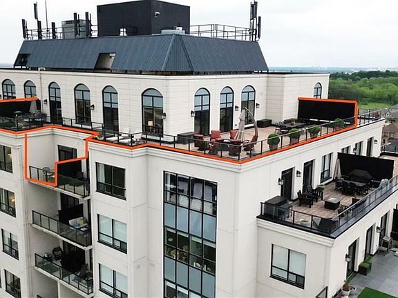 This stunning 2 storey top-floor penthouse offers a modern, elegantly appointed, New York style loft with 3 bedrooms + den, panoramic sunset views, 4 connected terraces (approx 1,715sqft) wrapping North and West for a total of approx 4,602sqft of indoor/outdoor luxury living. This condo surpasses all expectations with its incomparable level of opulence, expansiveness, and lavish comfort. A true testament to the pinnacle of luxury living. The interior showcases custom finishes & sophisticated design work. Many fantastic spaces for entertaining starting with the gourmet kitchen featuring a centre island with double sinks, induction cooktop, combination fast oven/microwave plus a convection wall oven, which opens to the dining room and spacious living room with the focal point being the floor to ceiling stone fireplace. Patio doors all open to the dramatic terrace with striking views of the City and Sunningdale Golf Course. This impressive floor plan continues to flow through the den/office displaying custom built-in cabinetry with additional access to the terrace for enjoying a lounge area with an outdoor kitchen and pizza oven. Great opportunity for an in-law/granny suite that has a separate entrance from the 13th floor offering a family room, 2 additional bedrooms, 2 bathrooms (one being an ensuite) and a further North facing balcony (approx 90sqft). Enjoy 3 premium underground parking spaces, 1 exterior parking space and 2 large lockers for additional storage. Village North offers an exciting amenity centre including an indoor salt-water pool, stunning resident lounge with a gorgeous outdoor terrace, billiards room and bar, theatre room, gym and a state of the art golf simulator. Condo fees include heat, a/c and water.