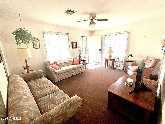 This lovely two-bedroom home is perfect for full-time living or snowbirds seeking a comfortable retreat. The exterior features a combination of chain-link and block walls, providing both security and privacy.