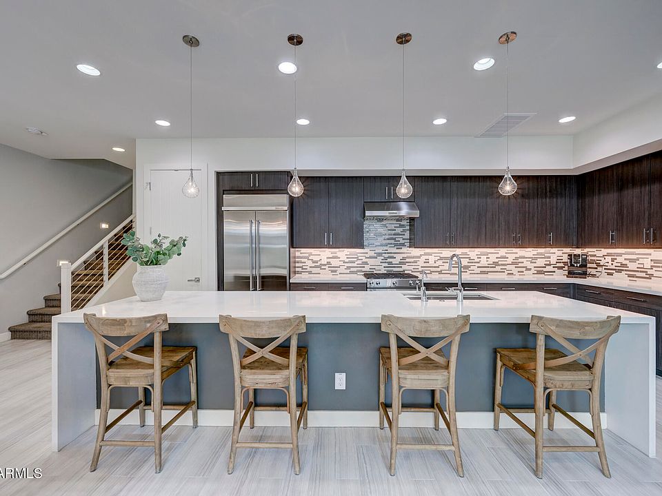 Discover upscale city living in this stunning 3-bedroom, 2.5-bath residence featuring modern design and elegant finishes. The chef's kitchen is a true showpiece with stainless steel appliances, an oversized waterfall island, and seamless flow into the open-concept living space. A 12-foot multi-slide glass door extends the indoors to a private patio, perfect for entertaining. Retreat to the expansive owner's suite, highlighted by a spa-inspired bathroom with a dual/rain shower and designer details. The home also features a private rooftop deck with breathtaking mountain views—an ideal spot for sunset gatherings or quiet evenings under the stars. Custom designer touches throughout elevate the ambiance, creating a one-of-a-kind modern retreat in the heart of North Central Phoenix.
