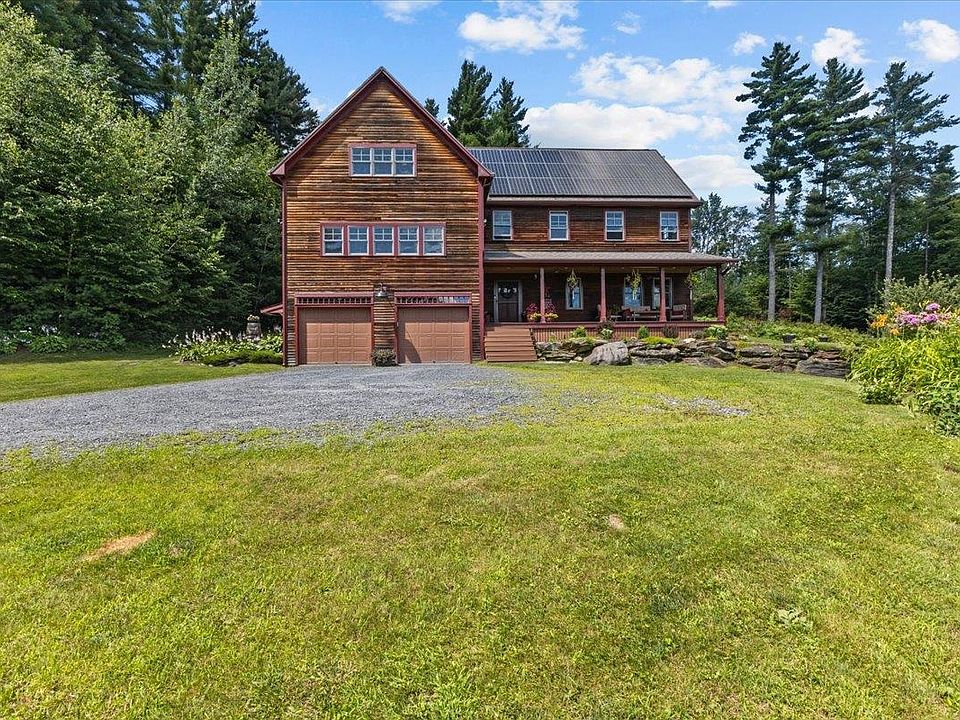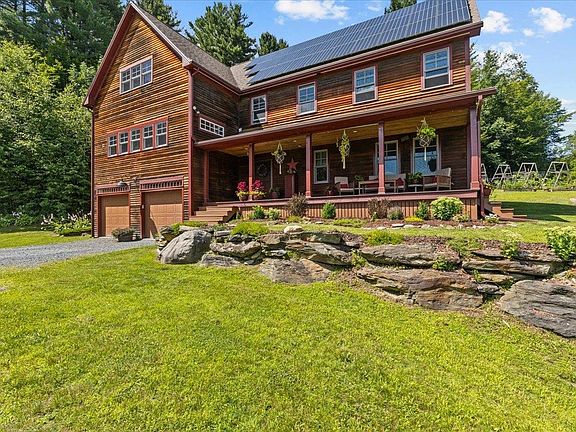 Stunning views & serene landscapes surround this spacious, energy-efficient home, offering the quintessential Vermont experience with modern amenities. Perfect for entertaining, this light-filled home features multiple indoor & outdoor spaces. The kitchen boasts maple cabinetry, butcherblock countertops, & new stainless steel appliances. The open kitchen/dining/great room has soaring ceilings and a cozy hearth. The home includes 4 bedrooms, 3 full baths, a loft family room, office, bonus room with walk-in closet, bedroom-level laundry, a renovated home gym/rec room with a mountain mural, totaling over 3000 sq. ft. South-facing windows showcase fantastic mountain views. The oversized double garage provides ample storage. Stay warm with a 5-year-old solar energy system, radiant heat, new smart wifi/electric water heater, high-efficiency propane boiler, Energy Star appliances, outdoor wood boiler, a high-efficiency wood stove with electric blower. Enjoy the fire pit under the clear Vermont sky. The covered porch overlooks a private spring-fed pond with solar aeration, perfect for swimming in summer and ice skating in winter. The property includes organic blueberries, blackberries, an apple tree, perennial gardens, raised-bed vegetable & herb gardens supported by a rainwater collection syystem. A whole-house automatic generator is included. Close to I-89 & Mad River Valley, this home offers peace, privacy, and tranquility. Enjoy school choice as well in the school district.