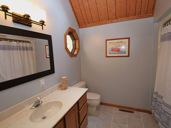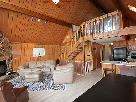One of the best spots on the lake! Beautiful, quality built chalet with steel sea wall, boathouse, jet ski lift, deck and storage. Great room concept with floor to ceiling glass, main floor has very nice kitchen, dining area, fireplace, bedroom, bath, large lakeside deck and upper loft. Walkout basement has 2 bedrooms, family room, bath, laundry / storage room, patio and fire pit. Skylights in bath & kitchen, new roof on house and shed 2013, boast house motor replaced to direct drive with 7500# capacity, lakefront deck 2015 and water heater 2015. Appliance negotiable. Contingent on 1st rights of refusal.