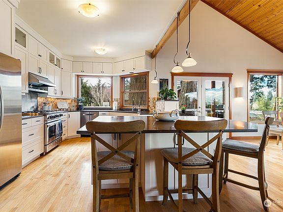 Stunning custom built home in the highly desired Samish Hills neighborhood. First time on market. Breathtaking views of Bellingham Bay, walk to Lake Padden & Galbraith Mountain. This home has been thoughtfully designed by local architect with the home chef and entertainer in mind. Kitchen recently renovated, large island with ample seating will be the heart of the home. Sweeping open floor plan flows seamlessly throughout. From the deck you will enjoy amazing sunsets. Upstairs primary suite feels like its own wing with private bedroom & balcony, large bathroom with custom linen closet & huge walk-in closet. RV parking & hookups, large detached garage with 280 sqft finished bonus space above & garden shed. This home will not disappoint!