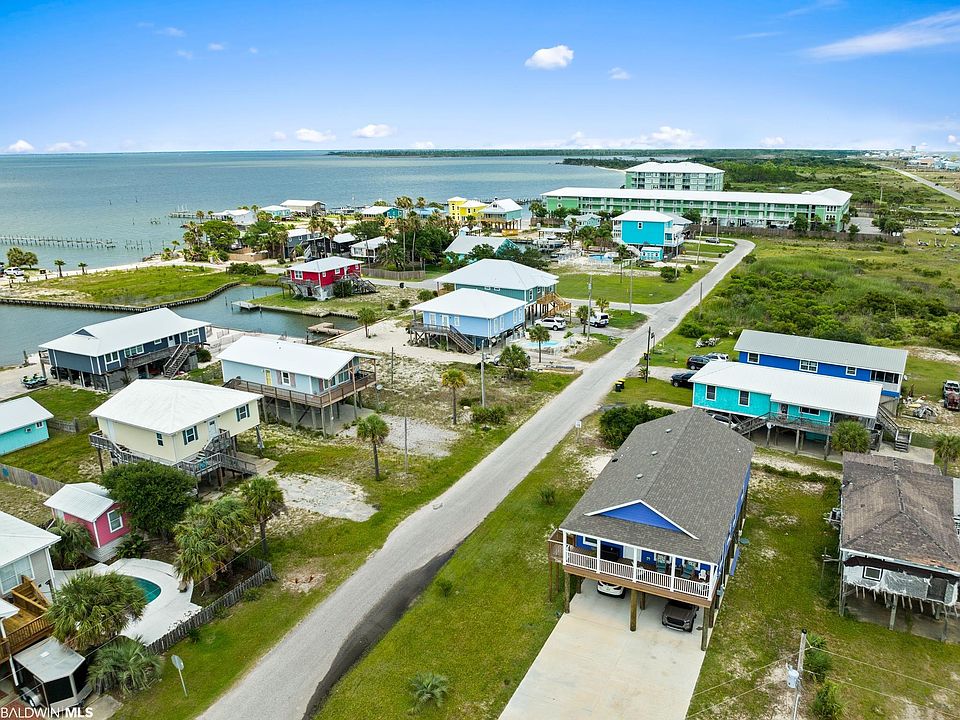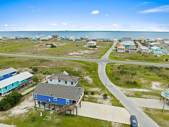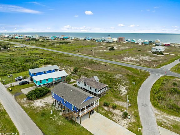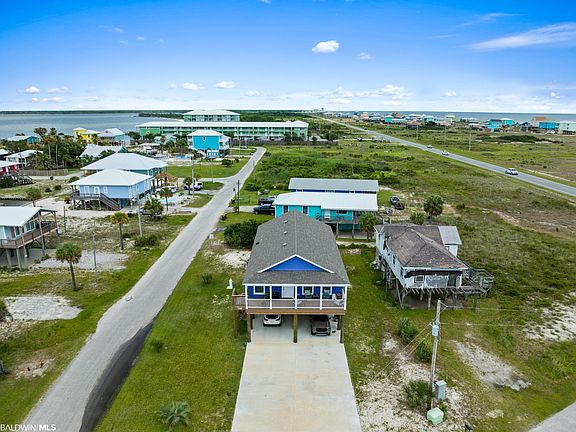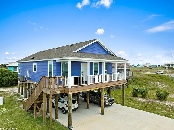 I spy WATER! Yes! You can see the beautiful waters of Gulf Shores from the front porch, kitchen window, primary bedroom. Do not miss out on your opportunity to call this home yours! Nearly NEW CONSTRUCTION that has highly desirable details and upgrades. Exterior boasts of a large CORNER LOT, HARDIPLANK siding, 30' covered front porch, 2X6 stud exterior wall, 30' x 66' driveway, covered parking enough for 6 vehicles, FIRE RATED underpinning, encased plumbing for easy access. You will appreciate that you already have a Satsuma, Pindo Palm, and an Olive tree. Once inside, you will appreciate the large open area that includes the kitchen, great room, dining as well as the CROWN MOLDING IN EVERY ROOM, LVP flooring throughout and 36" doors throughout. The windows are trimmed out, and full length which allows you to enjoy the VIEW and bring the SUNSHINE indoors. Great Room has recessed lighting and ceiling fan with multiple wall options for your big screen TV. This kitchen is something to "write home" about with High-End CAFE STAINLESS appliances, GAS Cooking, pot filler, Granite counter tops, subway TILE backsplash, Farm style Apron sink, shaker style cabinetry with several large DRAWERS, recessed and pendant lighting. Primary bedroom with spectacular ensuite bath. Primary bath has granite, double vanity, show stopping TILE SHOWER with multiple shower heads, comfort height toilets, and walk in closet. Laundry Room has extra cabinetry. Tankless water heater and security cameras. Per seller, no HOA and can Airbnb. All information provided is deemed reliable but not guaranteed. Buyer or buyer’s agent to verify all information.