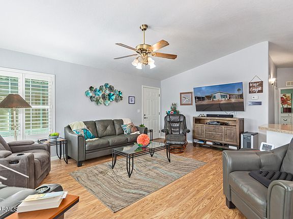 Don't miss this charming home in the popular 55+ Community in Apache Junction! Displaying lovely desert landscape, a cozy front porch, and 2 carport parking w/separate storage room. Discover a perfectly flowing open layout paired w/ plantation shutters, vaulted ceilings, neutral paint, LVP flooring, and tons of natural light. The fully equipped kitchen boasts ample wood cabinets, spacious counters, recessed lighting, mosaic backsplash, RO system, and an island w/breakfast bar. Main bedroom has a walk-in closet & a private bathroom. Relax under the screened-in patio w/out worrying about the weather! Out the back, you have a covered patio where you can entertain your guests. Enjoy the neighborhood amenities, including a heated pool, spa, tennis courts, gym, & more! This one won't disappoint!