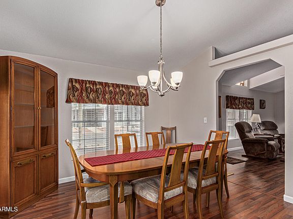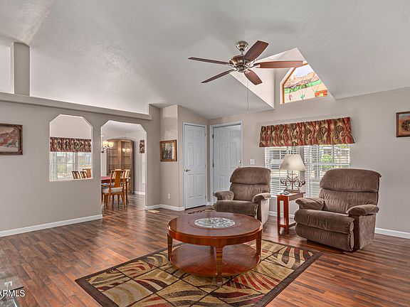 Welcome to your new oasis! This charming home nestled in the heart of Apache Junction is ready to make your dreams of comfortable living in a 55+community come true. Come inside and be captivated by the warm and inviting atmosphere that envelops you. Gleaming wood-look flooring flows gracefully throughout, creating a seamless and elegant transition from room to room. A soothing neutral palette sets the stage for your personal style to shine, making it effortless to customize and transform this space into your very own haven. As you explore further, you'll be greeted by the grandeur of vaulted ceilings that elevate the sense of space and airiness, enhancing the overall ambiance of the home. The spotless eat-in kitchen beckons, a culinary canvas awaiting your skills to craft delectable recipes. Imagine preparing gourmet meals amidst the backdrop of white cabinetry crowned with charming moulding, complemented by the timeless allure of granite countertops. Plantation shutters add a touch of classic sophistication, allowing you to control the natural light that fills the room. And at the heart of it all, a center island stands ready to be the focal point of both your cooking endeavors and delightful conversations. Retreat to the primary bedroom, a tranquil sanctuary that boasts a generously sized mirrored-door closet, providing ample storage space for your wardrobe and belongings. The en-suite bathroom offers a touch of luxury with dual sinks, ensuring mornings are a breeze as you prepare for the day ahead.