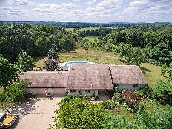 Breathtaking Hilltop Views! 2400sqft home on 5acres w/6car garage! Live atop a ridge where views for miles are evident from most every room! This ranch style home has 3 bedrooms & 2 full baths. From the double door entry, you'll appreciate the character in the home. The kitchen & dining area is spacious w/an abundance of cabinets & counter top space. The living room & family rooms, both w/a wall of windows are separated by a wood fireplace. The family room/sunroom is open to the fenced in patio w/inground pool & entertaining area. The master bedroom features a master bath spa retreat w/jetted tub & walk in tile shower. Room for all your toys in the 2.5 car attached garage/workshop; or 3.5 car 32x40 detached garage/workshop area w/storm shelter. Enjoy a million dollar sunset whether you are lounging in the pool, bathing in the jetted tub, or laying in bed! Call Kerry Keefer Fischer with Five Star Real Estate 269-998-4062