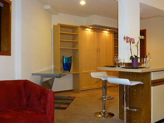 *Bedroom: custom Murphy bed with full size (75"L x 54"W) med-firm mattress, built-in shelves/drawers, and bed linens.