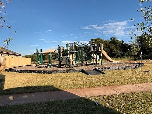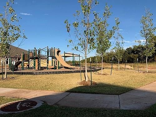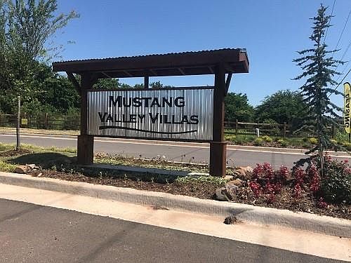 2 bedroom 2 bath 2 car garage DUPLEX in the Mustang Valley Villas community off Morgan Rd just north of SW 29th Street in OKC. Mustang school district. Gated neighborhood with small private fenced yards, weekly lawn care included. Open plan with kitchen island overlooking the living and dining areas. Master suite features a large corner tub, separate shower, double vanity and large walk in closet. The kitchen has Stainless Steel appliances with gas range and built in microwave. Community has a playground and walking trail that will continue along the creek as construction progresses. Woodlook tile throughout the main living areas, carpet in the bedrooms.