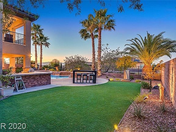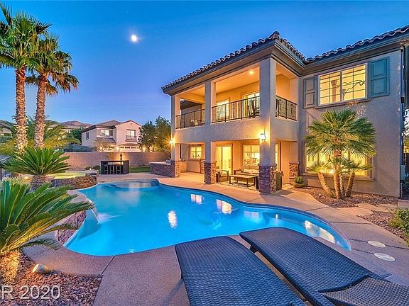 Corner lot with Strip and Mountain views! Well-appointed kitchen has granite counters, stainless steel appliances including, built-in convection oven, built-in refrigerator, 5-burner cooktop, and built-in microwave. Spacious family room lives like a great room being open to the kitchen and is ideal for gatherings. The formal living and dining room have doors to the wrap around covered front porch. The loft/game room has a built-in entertainment center and a slider to a balcony. Grand master has a large balcony with strip and mountain views. A sliding farmhouse door entrance to the master bathroom with a walk-in closet, jetted tub & walk-in shower. Throughout this remodeled home you will find upgrades like updated light fixtures, large 12x24 tile floors, wood floors, new bathroom countertops, whole house intercom system and more. Backyard is perfect for entertaining, featuring lush low maintenance landscaping, pool, spa, gas firepit, built-in BBQ, covered patio, and a large side yard.