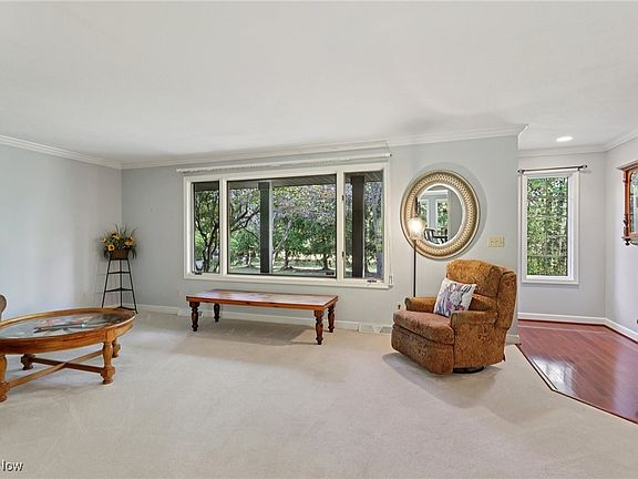 The formal living room features a lovely picture window, offering views of the private and peaceful wooded front yard.
