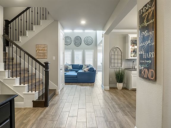Beautiful two-story home on a landscaped corner lot in the highly sought-after Southpointe Subdivision within Mansfield ISD, offering 4 bedrooms, 4 full baths, and a 2-car garage. This spacious layout features high ceilings, upgraded light fixtures, and plantation shutters throughout. The main level includes two bedrooms and two full baths, along with a formal dining room showcasing a stylish feature wall and wet bar—perfect for entertaining. The kitchen is appointed with white cabinetry, a gas cooktop, and ample prep space, while the primary suite boasts a custom closet system and a relaxing garden tub. Upstairs you’ll find two additional bedrooms, two full baths, a large game room, and a dedicated media room for movie nights. Additional highlights include a utility room with built-in shelving, covered front porch and back patio, full guttering, and a sprinkler system. Designed for both comfort and functionality, this home blends thoughtful upgrades with versatile living space.