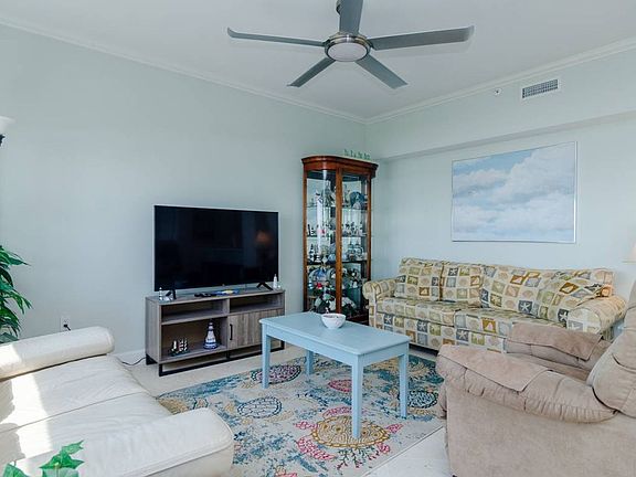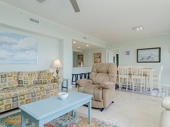 The main living area offers a comfortable living space and a beautifully renovated kitchen that opens to a spacious horseshoe balcony to maximize the ocean views. The deck is the perfect place to catch a spectacular sunrise or relax at the end of a long day. The spacious primary suite is complete with a king-sized bed, television, and updated bathroom that features a walk-in shower and large closet. There are two additional guest bedrooms at the front of the condo that overlook the marsh. A king guest room makes a wonderful accommodation for guests of any age and a nearby hall bathroom services this guest room. Across the hall is a bunk bedroom that has a pyramid bunk bed (full over full) and a private bathroom.