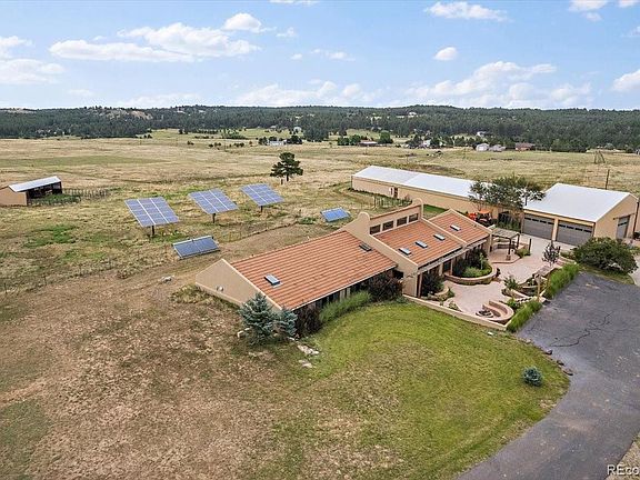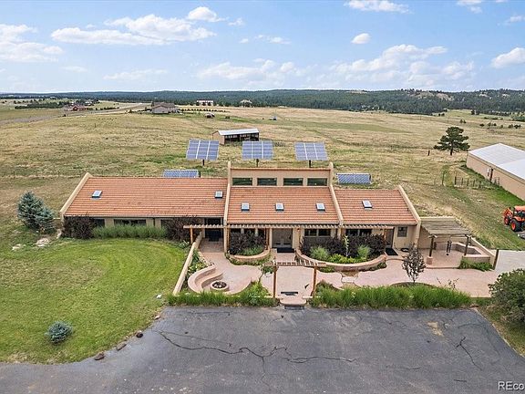 Ready to be self sufficient but with all the modern amenities? Come see this 35 Acre Equestrian Property with stunning views. Zoned AG with no Covenants. The land is also potentially sub dividable, which is a rare opportunity in Douglas County. The 10KW Solar Array provides electric with net metering so you can bank excess electricity. The evacuated tube solar Hot Water collectors provide domestic hot water stored in two separate tanks. During the winter hot water is pumped through the furnaces to help heat the building with electric backup Two separate heating and cooling systems allows for further energy conservation by heating or cooling the bedrooms independently of the rest of the house.. Grow your own vegetables in the huge 40x50 irrigated greenhouse. Domestic/Livestock well allows for raising livestock and/or horses. The gated, paved driveway leads to the secluded home. Enter through the tranquil patio with custom water feature. Inside, you will find 4 bedrooms , a large office and gourmet remodeled kitchen, stunning tile and hardwood floors, soaring ceilings in the great room, and skylights which bring in an abundance of natural light. The barn is approximately 7800 feet and includes approximately 1200 sq feet of high strength concrete plumbed for in heating. The property also includes 2 equestrian outbuildings and a fenced perimeter.