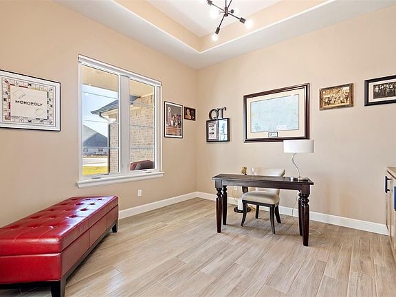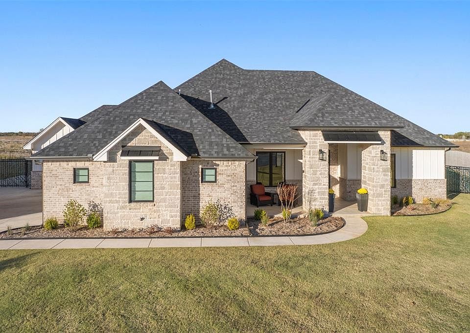 Beautiful 4-bedroom, 3.5-bathroom home in gated neighborhood on a spacious 1/2 ACRE lot conveniently located near the Kilpatrick Turnpike. Open floor plan with living room that features remote controlled linear fireplace , large windows with plenty of natural light and remote controlled shades. Kitchen has a large island with quartz counter tops, stainless steel appliances, custom cabinetry,and remote controlled vent hood. The primary bedroom features attached bathroom, with dual vanities, a gorgeous stand alone soaker tub, and a large walk-in rain shower. Large office space with built-in shelves and cabinets is perfect for working from home. Upstairs has sheetrock, paint, baseboards, wired with electric and lights and is ready to be finished out with flooring! STORM SHELTER! Back patio features a stone fireplace, outdoor fan, and TV, ideal for entertaining or enjoying quiet evenings. The backyard also includes a dedicated dog run, making it a great space for pet lovers. This neighborhood has WALKING TRAILS and a pond, perfect for those who appreciate the outdoors. Don’t miss the chance to make this wonderful home your own!