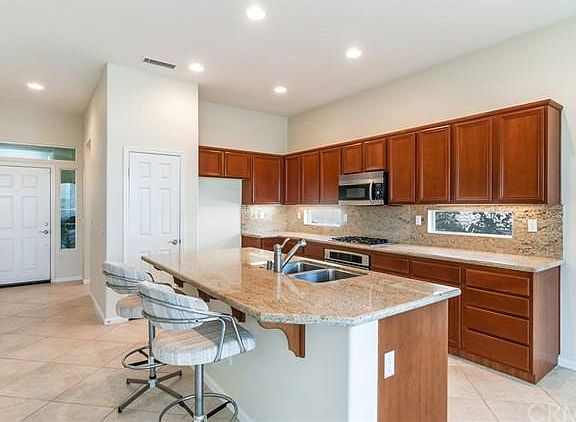FALL in love with this beautiful well kept home located in Trilogy @ Glen Ivy. This beauty features oversized tile in the entry, kitchen, great room, dining area and both bathrooms. A light and bright open kitchen concept with granite counter tops, a center island with bar stool seating, stainless steel sink, stainless steel dishwasher, oven, stove top and a built in microwave. Plenty of counter space with lots of cabinets for storage, pull out shelves and a separate pantry. The kitchen opens into the great room and dining area which is complimented with a cozy fireplace for those cool winter nights, custom built in entertainment center and a sliding door to the patio. This floor plan features a office/bonus room at the entry. The main bedroom is good size complete with a ceiling fan and a second sliding door to the extended patio. The main en-suite bathroom has a double sink vanity, tile counter tops, a walk in shower and spacious walk in closet. The guest bedroom has a ceiling fan, plantation shutters, a guest bathroom en-suite, a single sink vanity and a tub/shower combination. Custom window coverings in the main bedroom, dining area and great room. Neutral colors, dual pane windows and ceiling fans throughout. Indoor full size laundry room with a sink, cabinet and direct access to the two car garage. The garage has built in cabinets for even more storage and access to the side yard. The patio is perfect for enjoying your morning coffee or just relaxing with many flowers and mature trees. This premier active adult community offers many resort style amenities including a gym, heated pool, spa, clubhouse, hiking trails and much more! The Shops at Dos Lagos and the Crossings are just off the freeway. This is a must see, it won't last long. Don't miss out!