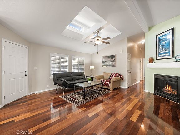 Come and view this stunning 3 bedroom, 2 bathroom luxury home in the coveted community of Forest Gardens. From the moment you enter, you are swept away by the warmth this property has to offer. The home has a terrific floor-plan that flows seamlessly throughout, with a large living room that offers high ceilings, garden windows and recessed lighting that is enhanced by a cozy fireplace. The remarkable chef’s kitchen is a culinary masterpiece that is fitted with newer appliances, a nicely sized center island, attractive corian countertops and plenty of cabinet and counter space. The informal dining area is wrapped by large windows that easily floods in the natural light. There is an over-sized formal dining room perfect for entertaining family and friends. The Primary Suite is perfectly placed in a private location at the back of the home with vaulted ceilings, two walk-in closets and an attractive Master bathroom equipped with dual vanity sinks and a walk-in shower. The two additional bedrooms have an abundance of space, one with a spectacular built-in that can easily be utilized as a library or den. The common bathroom is wonderfully outfitted with new updated fixtures. The home showcases all new hardware, genuine wood flooring throughout, custom wood shutters, ceiling fans and skylights. The spacious indoor laundry room has its own sink, plenty of cabinet space and direct access to the outside. The large covered patio extends the length of the home and is great for morning coffee or al fresco dining, a perfect space to enjoy margaritas or lime meringue pie made fresh from your very own lime tree! Additional features include: a tropical front yard with drip sprinkler system, a detached office/workout area/art studio, a mature lime tree in a peaceful yard and a water heater that is only 2 years old. Community amenities include: sparkling heated pool, large spa, steam room, clubhouse, library, well equipped gym and tennis courts. Plus, community events all year around. Experience the epitome of luxury living in this one-of-a-kind residence, that exceeds the highest standards of elegance and sophistication. Don’t miss your opportunity to call this exquisite home your own!