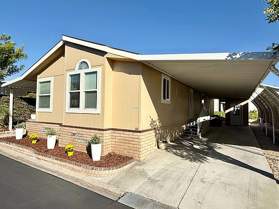 Discover peace of mind and exceptional affordability in this beautifully maintained 2013 manufactured home, perfectly positioned within a premium, gated community known for its excellent amenities and dog-friendly atmosphere. This property offers the perfect blend of modern convenience and the highly sought-after lock-and-leave lifestyle. The owner is offering an unprecedented $10,000 flooring allowance, providing you with the rare opportunity to customize the main living areas to your exact taste, ensuring a personalized feel from day one! Inside, the home shines with a bright, elegant floor plan. Dramatic vaulted ceilings enhance the spacious Large Great Room, complemented by central heating, air conditioning, and energy-efficient ceiling fans. The large kitchen is a delight, featuring a sun-drenched skylight, ample countertop space, beautiful wood-shaker cabinets, and all appliances (fridge, stove, microwave, dishwasher, washer, and dryer). The private master suite offers essential comfort features, including a large, accessible step-in shower and a double-sink vanity. Outside, enjoy excellent curb appeal from the shaded comfort of your large covered porch. The covered carport provides parking for two vehicles, with extended posts and a privacy screen. Located conveniently close to nearby shopping and dining, and with a backyard ready for a small garden or patio, this home defines easy living. Don't miss this opportunity for affordable luxury! If you've been looking for the perfect Home In the Best Mobile Home Park in South Orange County, then look no further. Forest Gardens Mobile Home Park is a Premier Manufactured Home Community offering a Sparkling Pool and Spa, Tennis Court, a Fitness Center, a Large Community Center, Planned Activities, a Friendly Atmosphere, and Professional On-Site Management. See why so many happy residents call this the Best Kept Secret in Orange County.