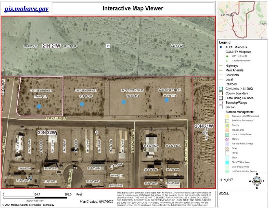 Great Location in Old Bullhead City, C2 just off Highway 95. Perfect for boat storage, mini storage or other income generating businesses. 2.5 acres ready to build on. Property consists of 4 lots 2401, 2447, 2472 and 2493 Seventh St. (Apn. #224-04-113,224-05-114, 224-05-115, 224-04-116).