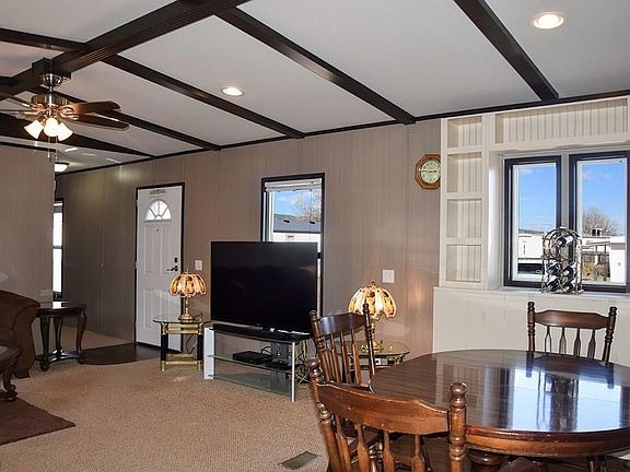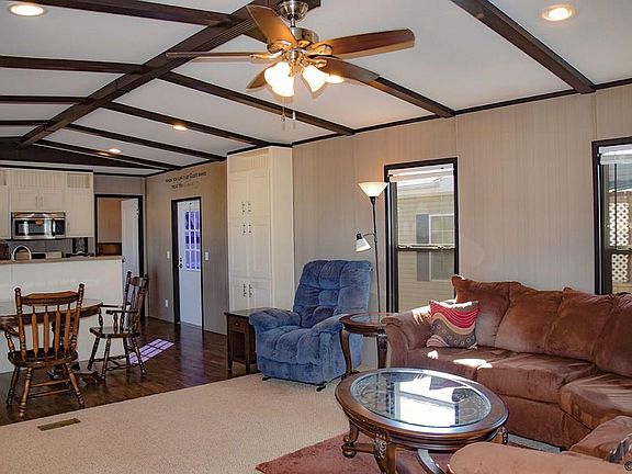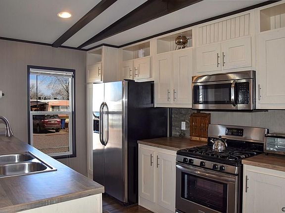 Like new! There is a lot to love about this clean 2016 Clayton home in the friendly, well-maintained Central Manufactured Home Community, with all stainless steel appliances in kitchen, window blinds, and washer and dryer included! High-ceilings with decorative beams and an open concept design give this home a fresh and modern feel, and features lots of windows to let in the Canon City blue skies and sunshine. Added comforts include central air conditioning, ceiling fans throughout, split bedroom layout, walk-in master closet, and an ensuite master bath with separate shower and jacuzzi tub. Also has a healthy patch of grass and a fenced yards for pets, up to 2 pets allowed. Lot rent includes water, sewer, trash, and cable. Park management has made recent improvements, including fresh gravel in the park driveway. Also includes two parking spaces and two sheds. Current loan may be assumed by qualified buyer.