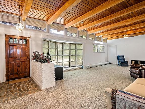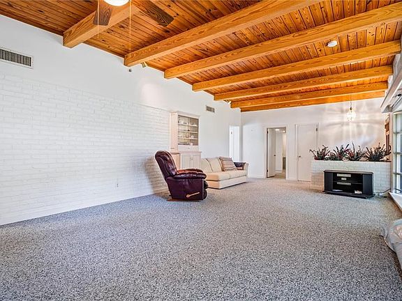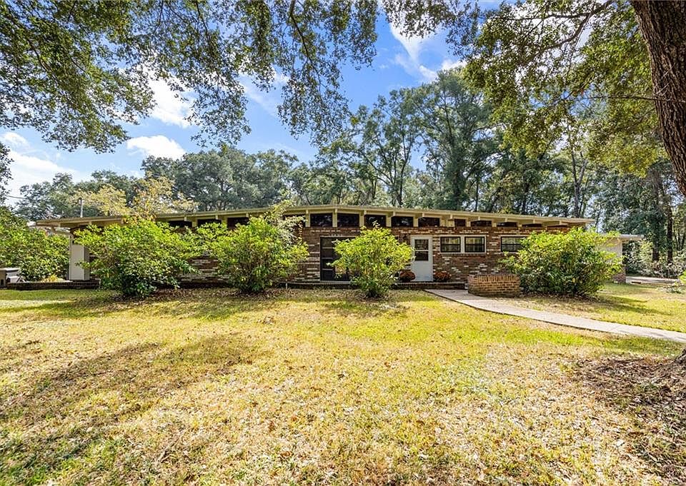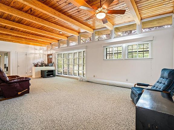 Lovely Mid-century modern ranch with amazing windows that line natural wood tongue and groove ceilings throughout the entire home. Lots of natural light, clean lines, and character. Original exterior brick with an attached brick and stucco two car garage. Four bedrooms and two bathrooms. The large open floor plan has an eat-in kitchen and a living-dining combo perfect for use as a great room. Surrounded by live oaks, birch, pecan and fig trees there is no shortage of privacy.