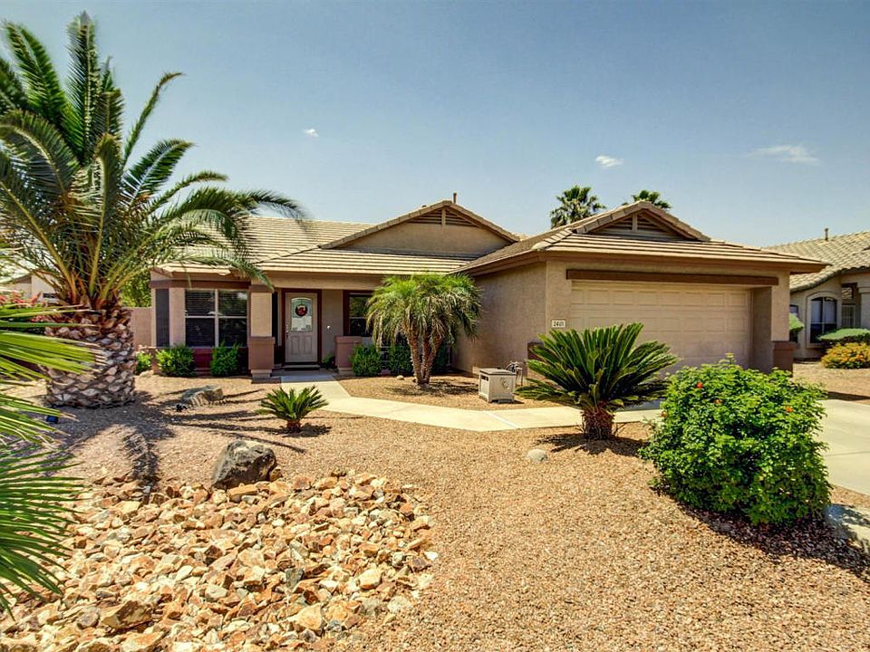 Great curb appeal Home with 3bd/2ba with 1713 sq ft. Soothing color palette, plush neutral carpet, soaring ceilings, and beautiful ceramic tile floor in all the right places. Double door entry to Den/Office. Fantastic family room with bamboo wood floor, and patio access. Center kitchen island, breakfast bar, plant shelves, SS appliances, and oak cabinetry. Cozy breakfast area with backyard views. All bedrooms are spacious with plenty of closets. Covered patio and easy to maintain desert landscape. Surround sound speakers do not stay with the house. Exterior painted in 2014. 12 bags of insulation were blown into attic 2013. Call today and start packing! Move-in ready!!