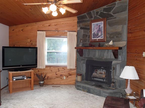 Home with a modern cabin feel. Pine accents throughout the main. Open living area with slate fireplace & vaulted ceiling. Roomy kitchen w/ breakfast bar. Plenty of space for a big dining table. Master-suite & laundry on main level, along with office space & utilities. Wood staircase to 2nd level loft with a view of the back yard. Another 2 bedrooms & 1 bath are upstairs. Mature trees for privacy.