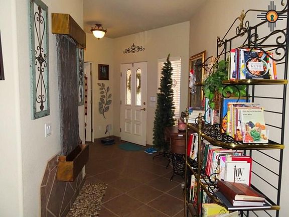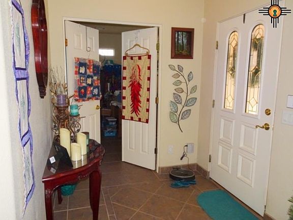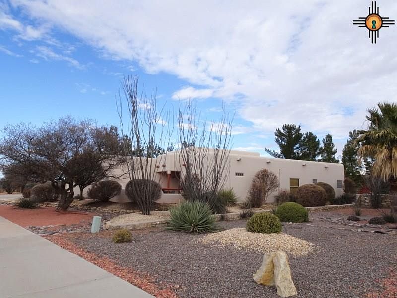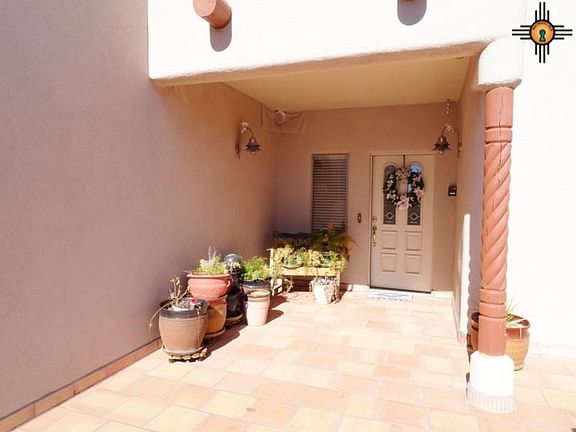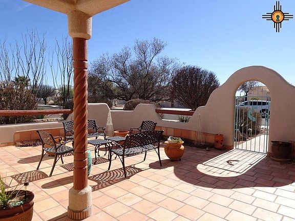 Country Club Estates, 3 bedroom, 2 bath, 2476 sq.ft. Santa Fe Style with 1040 sq ft, 3 car garage on 2 lots. Entry w/stone waterfall, to Kiva fireplace in living room with pot shelves, dining alcove, french doors to covered Patio and Gazebo w/hot tub. Open seating counter to kitchen with granite countertops, compactor, range top, double ovens and center isle seating. Huge Pantry, Office area and Utility room w/built-ins and "Doggy Door" entrance to the "Doggys" side yard. Master Suite has large walk in closet, separate sinks areas, jetted tub and separate shower. 2nd and 3rd bedrooms have large walk-in closets. Open, gated patio entrance, with landscaped yard and high stone wall around this totally upgraded property. CCE provides easy access to Downtown Deming and I-10 for commute to Las Cruces and Airport at El Paso, Texas Call