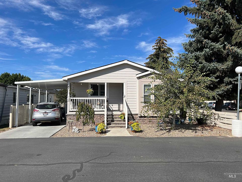 $3K to go to buyers closing cost or interest buy down. Beautiful newer modular home built by Nashua in the desirable central Boise Over 55 y/o Community of Owyhee Estates. 2x6 walls give it extra insulation making it more energy efficient. Rock covered front porch entry, stainless steel appliances, soft wood tone cabinetry, spacious open layout, covered carport, vinyl fencing, large storage shed & low-maintenance landscaping. Office/massage room with large sliding barn door has no closet but large enough to be used as a 3rd bedroom or media room. Shed, window shades, washer & dryer stay with the home. Buyer must be approved for residency by park management. BTVAI