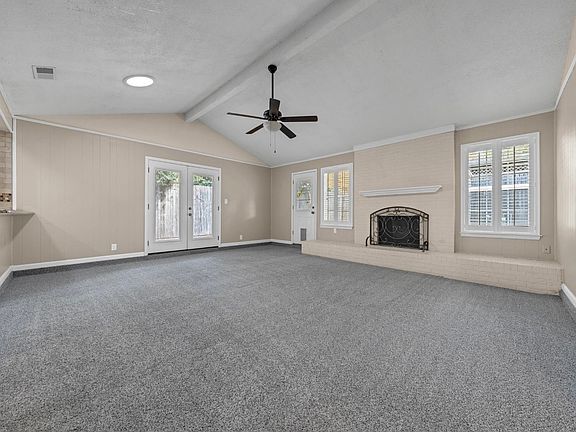 Covered patio areaStainless steel appliancesLarge windowsGranite countertopsFresh carpetPainted brick fireplaceVaulted ceilings