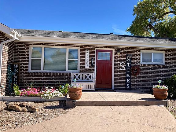 Don't miss this opportunity to own a meticulously maintained, brick ranch-style home! This spacious home features four bedrooms and two bathrooms. Primary bedroom is huge and has it's own bathroom. There are two family rooms, accented by beautiful newer floors, and one of the family rooms has a cozy fireplace. The kitchen features granite countertops, a breakfast bar, and a huge pantry. Other amenities include a large detached garage, multiple driveways, and the East Otero School District bus stop right out front. The private, east-facing backyard is an ideal space for relaxation or entertaining. The backyard is fully fenced, making it safe for kids and pets, and includes a dedicated dog run and storage area. The back patio offers welcome shade for evening enjoyment, with plenty of room for outdoor play equipment. Enjoy peace of mind with recent upgrades throughout the home including: newer flooring, central air, furnace, tankless water heater, gutters, fascia, three entry doors, garage door, sprinkler system, plumbing upgrades, custom concrete walkways, and landscaping. This home is situated on a generous 0.42-acre corner lot. A bonus is the R-1A zoning adjacent to C-1, offering a unique opportunity to potentially rezone and develop the undeveloped attached side lot for commercial use, such as a private shop, garage, or RV storage. Call to set up your showing today!