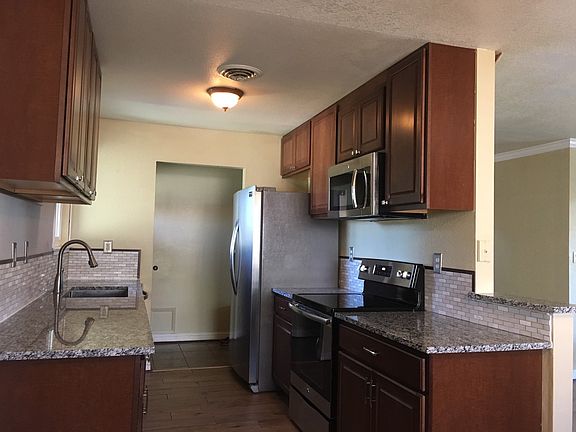 Close to schools and parks. This 4 bedroom 2 bath home features several new amenities including new kitchen cabinets, real granite counter tops and new flooring throughout. Home has a newer roof, and HVAC unit. Nicely landscaped back yard has numerous fruit trees. Front Yard has numerous Citrus Trees. Fully fenced front and back. Clean house, ready for a new owner.