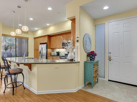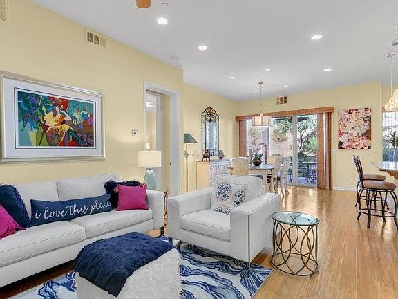 Come enjoy the good life in the luxurious gated 55+ community of Villa Portofino. Your ground floor end unit features high ceilings throughout creating a spacious feel with an open floor plan bringing the living, dining, and kitchen spaces into one. Additional den opens to the living area and is perfectly suited for an office, sitting room or crafts room. Unit separates your master bedroom with walk-in closet from your guests with both having en-suite bathroom access. Outside patio features beautifully desert landscaped hillside views plus a perfect area for barbecue grill. Condo also includes 2 car tandem parking garage with private access directly into your unit. Villa Portofino offers luxury living at an affordable price.