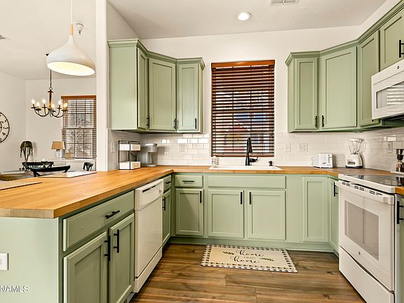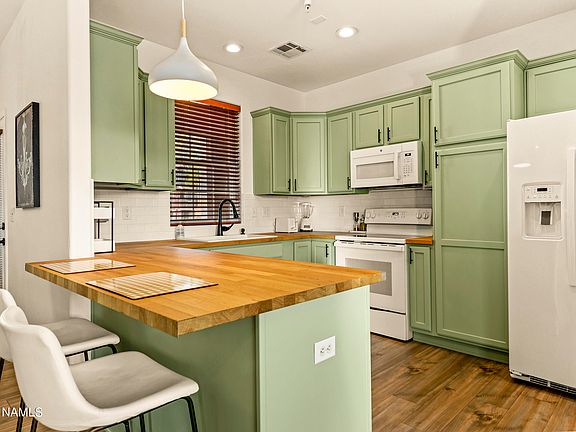 Ponderosa Pine Views! Situated at the highest point within the community, overlooking the treed surroundings and bordering green space for added privacy. Inside the home you'll find top to bottom upgrades featuring new flooring, interior paint, kitchen appliances, butcher block countertops, custom painted cabinetry, and newly added central air conditioning. The main level of the home consists of a large living room with accented gas fireplace, kitchen with breakfast bar, and a guest bathroom. On the second level you will find two bedrooms with updated ensuite bathrooms. A rare turn-key home under $500,000, and 2.5 miles to Downtown Flagstaff! Furnishings are negotiable.