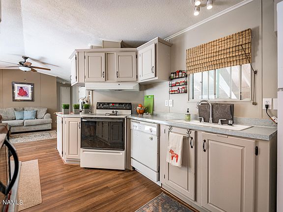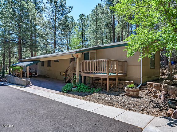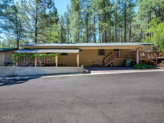 This immaculate manufactured home is located in the serene 55+ community of Wildwood Hills in West Flagstaff. Nestled on a premium treed lot, it boasts a spacious backyard with stunning open forest views. The home features a split floor plan with 2 bedrooms and 2 bathrooms, a generously sized living room, and a large kitchen with ample cabinet space. The expansive Trex back deck offers plenty of outdoor seating, perfect for enjoying the picturesque forested area behind the home. Additional outdoor storage is available in the 10x8 storage shed. Recent upgrades include a new roof within the last 9 years. The land is leased and includes snow removal, access to a community swimming pool, and community maintenance. Buyers must complete a lot lease application upon contract acceptance.