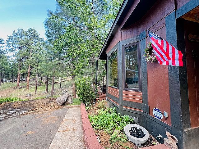 Welcome to the 55+ Wildwood Hills Community nestled in the Ponderosa Pines! Get ready to fall in love when you see the location of Lot 86! It is one of the most scenic and private locations in the park. Situated at the end of the road, this little slice of paradise offers privacy and beautiful forest views! The original 1987 Cavco home included 840 SqFt with 2 bedrooms and 1 bathroom. The owners added another 100 SqFt with separate entrances in the backyard and garage, which was used as an office. It could easily be made into a 3rd bedroom! Many improvements were made, including a remodeled kitchen (all appliances included), new roof, extra storage space, recessed LED lighting, double pane windows, central heating with smart thermostat and more! The best part is the scenic outdoor setting. While sipping your morning coffee you may see deer and other wildlife meandering past! Enjoy entertaining family and friends on the Trex wrap around deck or relax in the shade listening to the Aspen leaves rustling in the breeze. The land is leased with a monthly fee that includes access to a community swimming pool, clubhouse for events, exercise equipment, fitness classes; common area maintenance and prompt street snow removal. Don’t miss this opportunity to make this “cabin in the woods” your summer escape from the heat, winter playground or year-round retirement home with wonderful neighbors in the West side of Flagstaff, just minutes to all amenities. See the park map in photos for the correct location. Google Maps often shows the wrong location. More info at www.Wildwood86.com .