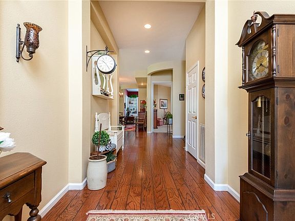 This popular TENAJA model located in the premier 55+ resort community of Trilogy at Glen Ivy is move-in ready. The wide entry leads to the open great room with connected kitchen, dining and living room with custom fireplace and entertainment center. There are 2 bedrooms, 2 baths + den, indoor laundry, and 2 car garage. The kitchen features a pantry, granite counters including a wrap-around breakfast bar and upgraded custom cabinetry. Flooring is beautiful hardwood in living areas and carpet in the bedrooms. Other features included shutters, high ceilings and storage cabinets in the garage. The master suite includes a walk-in closet, upgraded dual vanity sinks and full upgraded shower. The guest suite has its own upgraded bath and maintains its privacy from the rest of the house. The office/den has built-in bookcases and desk. 2 covered patios provide shelter for outdoor living. The popular Glen Ivy Golf Course meanders throughout Trilogy. HOA dues include front yard landscape maintenance, two pools, sports center, tennis, bocce, craft rooms, ballrooms, outdoor amphitheater and much more.