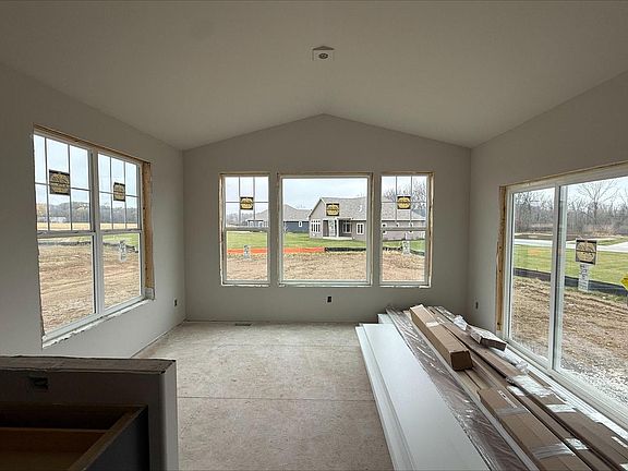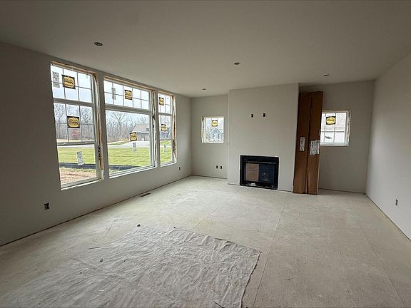 Norwood w/ sun-filled great room & 16'x12' sunroom. This open-concept home features a gas fireplace w/ stacked stone surround & transom windows in GR. Designer kitchen w/ stained cabinets, quartz countertops, tile backsplash, island w/ flush snack bar, & GE(r) appliances; microwave, dishwasher, slide-in gas range, chimney hood, & built-in look French door refrigerator. Walk-in pantry w/ melamine shelving. First-floor office w/ double swing glass doors; laundry/mudroom w/ cabinets, folding table, & built-in lockers. Primary suite w/ two walk-in closets, double vanity, separate commode, & 4'x5' tiled shower w/ wall-to-wall shelf & bench. Additional: walk-in closets in bedrooms 2 & 3, James Hardie siding, extended 3-car garage, basement bath rough-in, 2x6 construction & builder warranty incl.