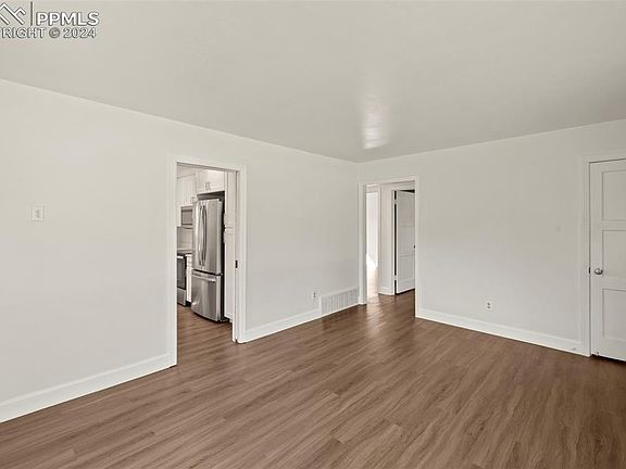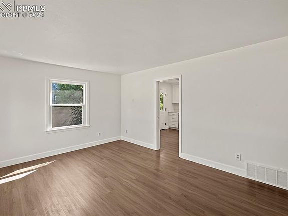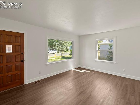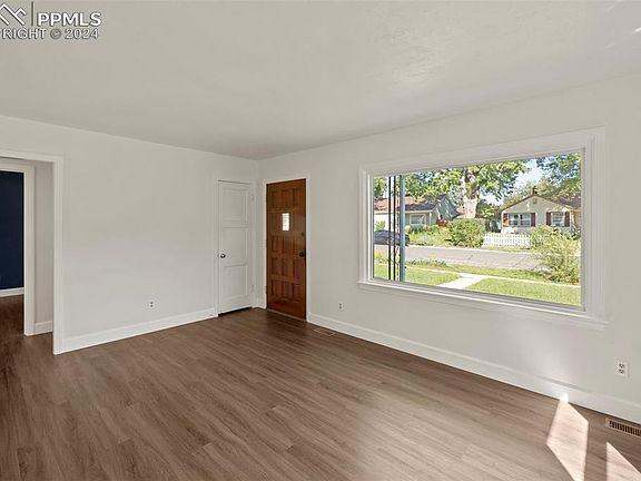 This newly renovated, charming 2-bedroom, 1-bathroom ranch-style home in the heart of Colorado Springs is a great find! The property now features brand-new floors, fresh exterior and interior paint, new windows and offers easy access to local amenities, including golf courses, hospitals, schools, and Highway 25. Inside, you'll find a bright and inviting living area with a large picture window, and a spacious, updated kitchen that includes 42" cabinets, new stainless steel appliances, quartz countertops, crown molding, and a huge farm-style sink with accessories—perfect for everyday living. Outside, the property boasts mature landscaping and a generously sized backyard, providing ample space for outdoor activities. This move-in ready home is ideal for those seeking comfort and convenience in a well-established neighborhood.