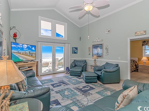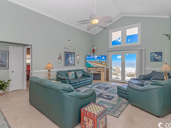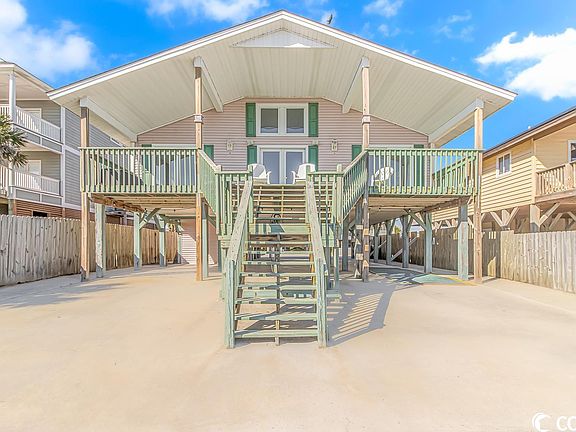 Oceanfront Cherry Grove home in super prime location just one block from Sea Mountain Hwy. Walk to the grocery store, multiple restaurants, shops, hardware store, ice cream shops, entertainment and much more. And no HOA! Gorgeous direct ocean and beach views from the large 9’ X 36’ front porch, just bring your sunscreen and flip flops and step onto the beach from your backyard. This home features four large bedrooms (two direct oceanfront) and four full baths on the main level, and an open floorplan with vaulted ceiling throughout the living, dining, and kitchen areas. On the ground level you’ll find a storage room for all your sandy beach chairs and toys and also a half bath. Wash off that sand with the outdoor shower before you go inside. This home has been well loved as a primary residence for over three decades, but is also well suited as an investment property. The roof was just replaced May 2023. This property is being sold AS-IS, come make it your own piece of paradise! The extraordinary opportunity to grab a location this ideal is rare. Schedule a private showing today!
