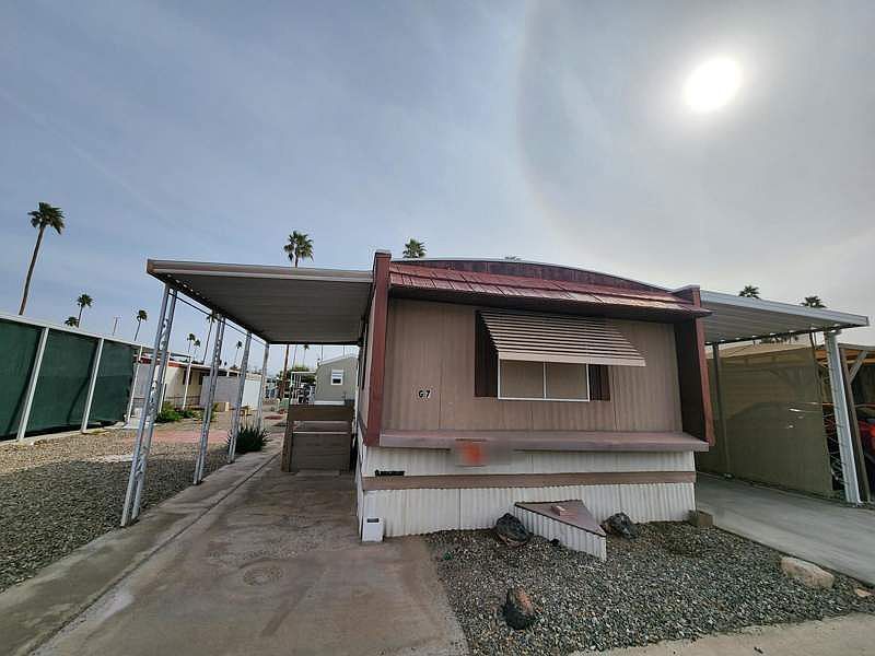 Buy this beautiful home! Large split plan 2 bedroom 1 bath home with a shower/tub. 2 carports, shed located in the back of the property. washer and dryer located in the bathroom as shown in the photos. Also this home has central heating and window a/c. This home is move-in ready. Beautiful and priced to sell don't let it get away from you. Call us Today for an appointment! Located in the fabulous 55+ community of Wildwood Estates in Yuma, Arizona.