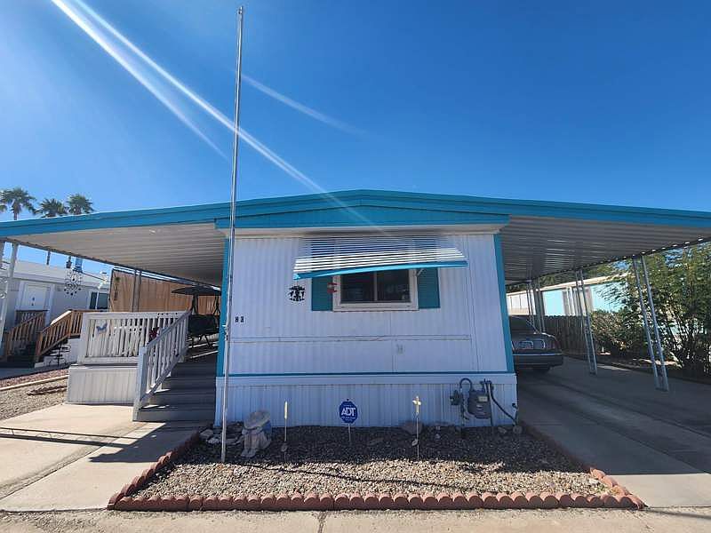 A Must See Home! This 1980 2 BDRM, 1 BATH home has a Large living room, spacious Dining room/ Kitchen that is perfect for entertaining. This home also comes with a washer and dryer that are conveniently located just off the kitchen area. the bathroom has a walk-in shower. Other features include a covered full size deck - great area to enjoy your morning coffee or relax in the evening as well as it comes with a storage shed. Located in the fabulous 55+ community of Wildwood Estates in Yuma, Arizona.