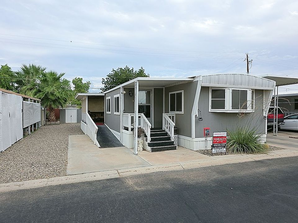 Split floor plan, two patios, wheelchair access, storage shed, and covered parking.
