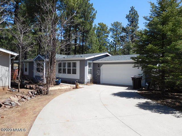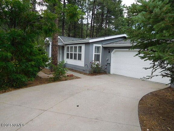 Gorgeous 3 bd, 2ba, mfg home on level lot. Cathedral ceilings, tape & textured walls, Laminate flooring throughout. Five ceiling fans, two skylights and air conditioning. Kitchen is bright and sunny offering five windows with wooden shutters. B/I microwave, Gas Stove/Oven, Island with tiled kitchen counter tops, 4'' tile backsplash. Freshly Exterior/Interior painting and NEW roof. Awesome 14' x 16' maintenance free , TREX covered deck. Heat strips in roof (3) 200 amp circuit for each section of home when it snows. Gutters and downspouts are heated as well. Garage offers built-in cabinets, shelving and insulated and drywalled. Large mature Blue Spruce and Ponderosa Trees offers privacy and beauty.